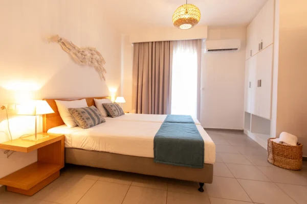 Situated on the ground and first floor, our Standard Double Studios surround the garden or have a view of the town and the hill on the other side. Our modern studios consist of two single beds with COCO-MAT mattresses. They have a balcony and a fully equipped kitchenette with cutlery, Nespresso machine, kettle, fridge.